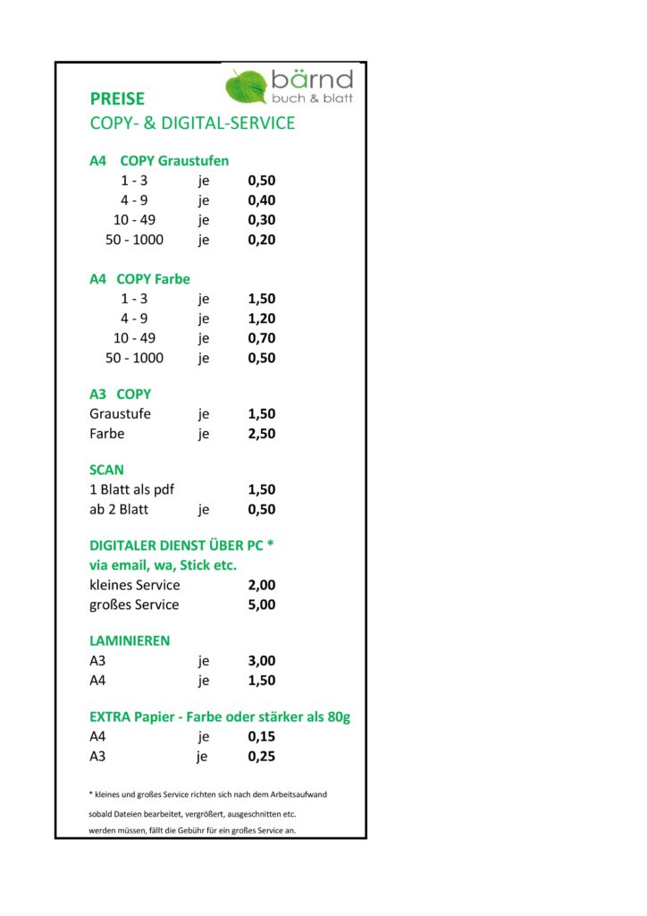 Wir haben einen hochwertigen Drucker / Kopierer, der sowohl mit A4 als auch A3 Papier arbeiten kann und exzellente Farben bietet. Eine große Auswahl an Papierarten und -farben steht in unserem Geschäft zur Verfügung. Normale Drucke, Kopien und Scans führen wir auf weißem Papier 80g aus.