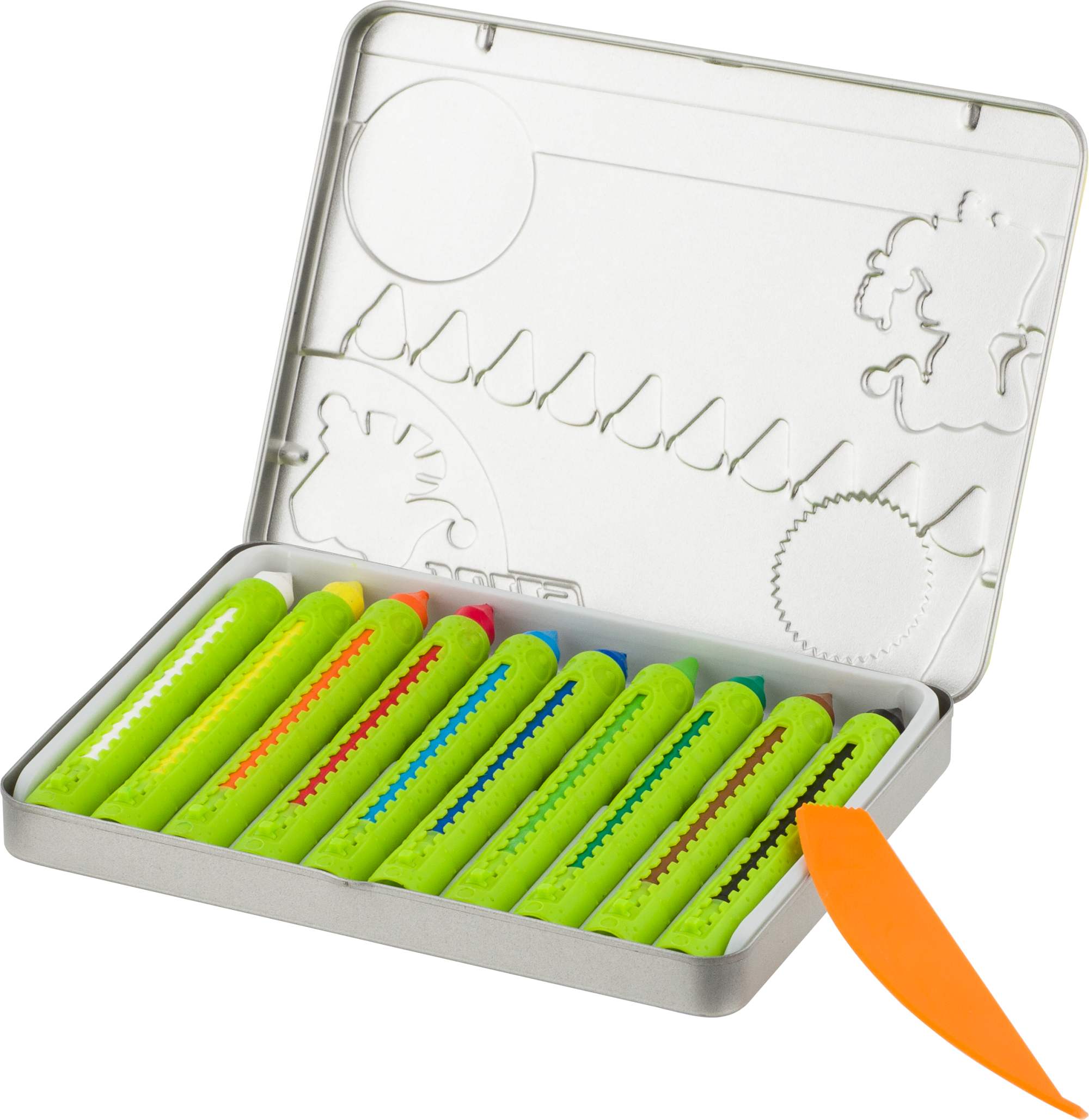 Superwaxies 10 Farben: Die Wachsmalkreiden mit ihren 10 leuchtenden Farben liegen besonders gut in der Hand. Mit dem Schuber lässt sich die Kreide einfach nachschieben. So bleiben die Finger immer sauber!