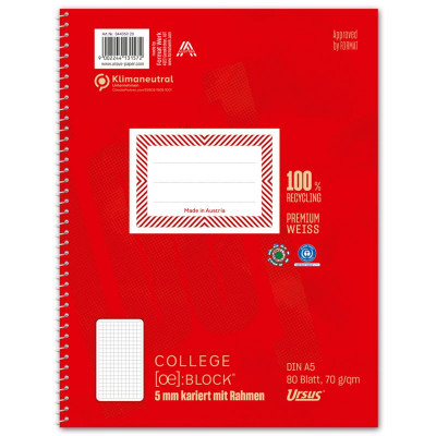 Ursus OE Collegeblock A4 80 Blatt 70g/qm 5mm kariert mit Rahmen 4-Loch